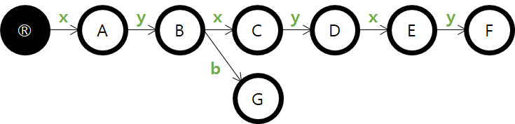 위 구조에서 탐색할 때, 노드 F에 문자 'b'에 해당하는 자식 노드가 없기 때문에 실패함수가 동작하는데, D노드로 이동합니다. D 노드에도 'b'에 해당하는 자식 노드가 없기 때문에 B노드로 이동합니다. 여기엔 'b'에 해당하는 노드 G가 존재하니 G로 이동합니다. 여기서 한 번만 실패 함수를 타고 올라가는 게 아니라 여러 번 타고 올라가야 함을 알 수 있습니다.