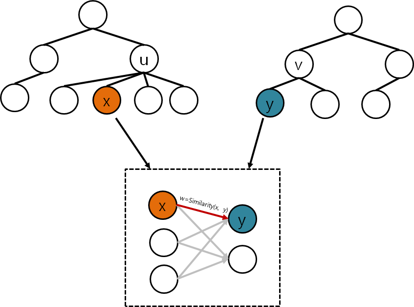 2. u의 자식 노드 중 하나를 x, v의 자식 노드 중 하나를 y라고 하자. 다시금 x와 y를 같다고 판별했을 때 결과값으로 나오는 서브트리 유사도를 x에서 y로 가는 간선의 가중치로 둔다. 모든 경우에 대해 수행하면 그 결과로 이분 그래프가 나온다.